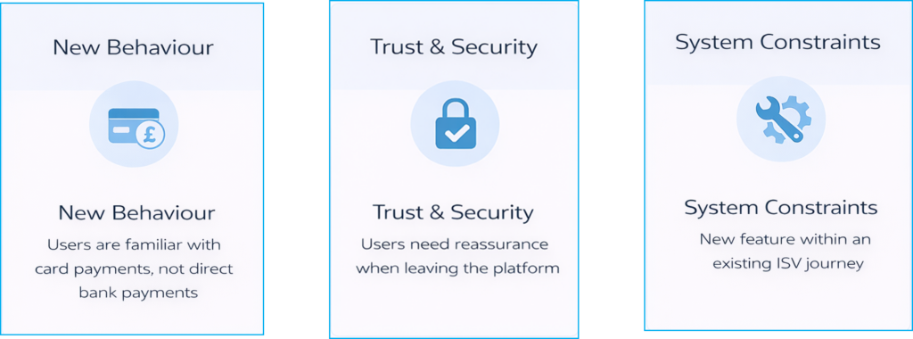 Introducing Bank Pay required more than adding a new payment option. It involved reshaping how users think about payments within a familiar journey. Customers are deeply accustomed to card-based transactions, and shifting this behaviour introduced uncertainty at key interaction points.