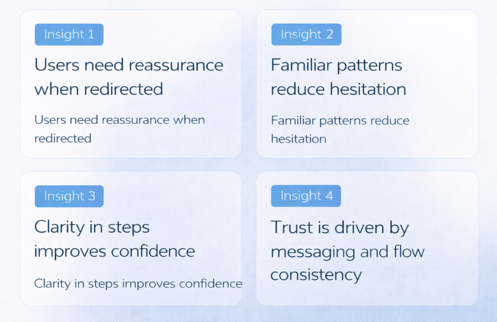 From these observations, several key insights emerged that directly informed the experience strategy. Users required reassurance when moving between platforms, particularly in a financial context where trust is critical. Familiar patterns played an important role in reducing hesitation, as users were more confident when interactions aligned with expectations.