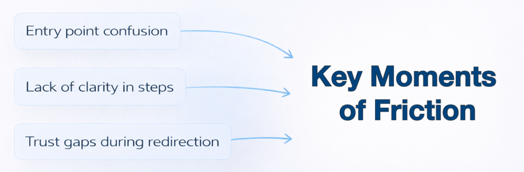 Key moments of friction emerged during transitions between platforms, particularly when users were redirected to their banking interface. These transitions introduced uncertainty, as users were unsure whether the process was secure or expected. Additionally, a lack of clarity in certain steps made it difficult for users to understand where they were in the process or what would happen next.