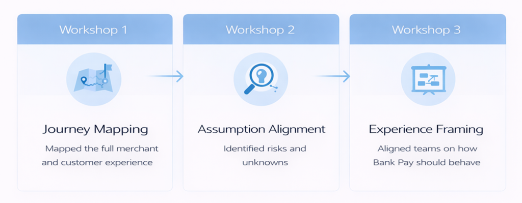 Through journey mapping, we were able to visualise the full merchant and customer flow, highlighting moments of friction and uncertainty. Assumption alignment sessions helped uncover gaps in understanding and identify potential risks early in the process. Finally, experience framing workshops enabled us to define how Bank Pay should behave within the journey, ensuring consistency and clarity across all touchpoints.