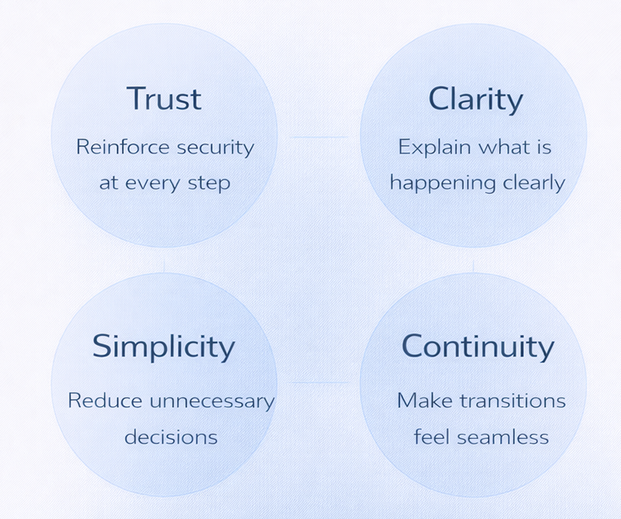 Trust was prioritised by reinforcing security and reassurance at every step of the journey. Clarity focused on making each interaction and transition easy to understand, reducing ambiguity for users. Simplicity ensured that unnecessary decisions were removed, allowing users to complete tasks with minimal cognitive effort. Continuity aimed to create a seamless experience across platforms, ensuring that transitions felt intentional rather than disruptive.